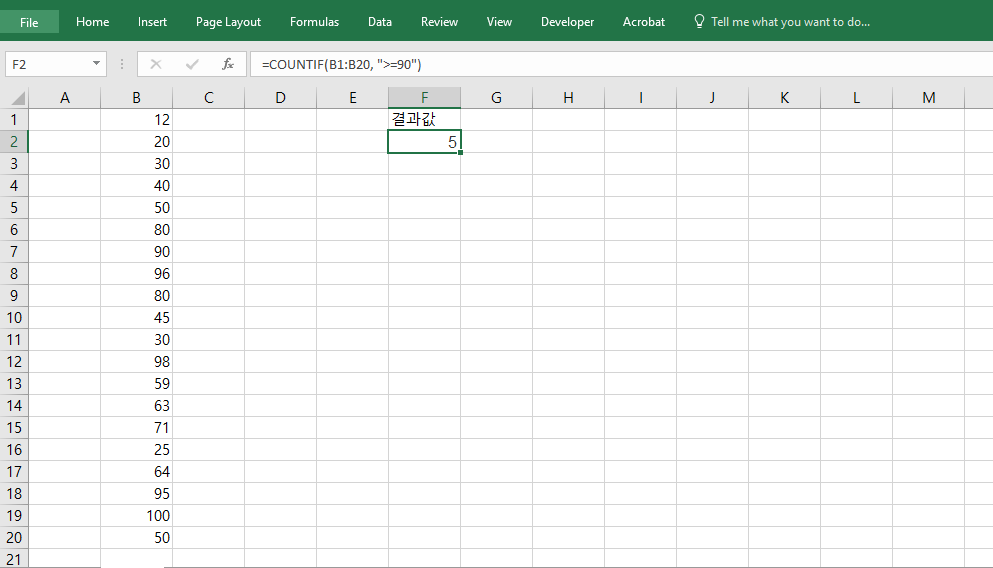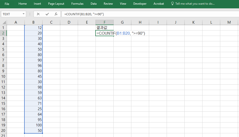 =COUNTIF(B1:B20, ">=90")은 B1부터 B20 범위에서 90 이상인 숫자의 개수를 계산합니다. 시험 점수, 매출 실적 등 숫자 기반 조건 계산에 적합하며, 특정 기준 이상인 데이터만 추출하여 집계할 수 있어 평가 시스템이나 분석 자료에 자주 활용됩니다. 조건부 서식과 결합하면 실시간 경고 기능도 구현할 수 있습니다.
