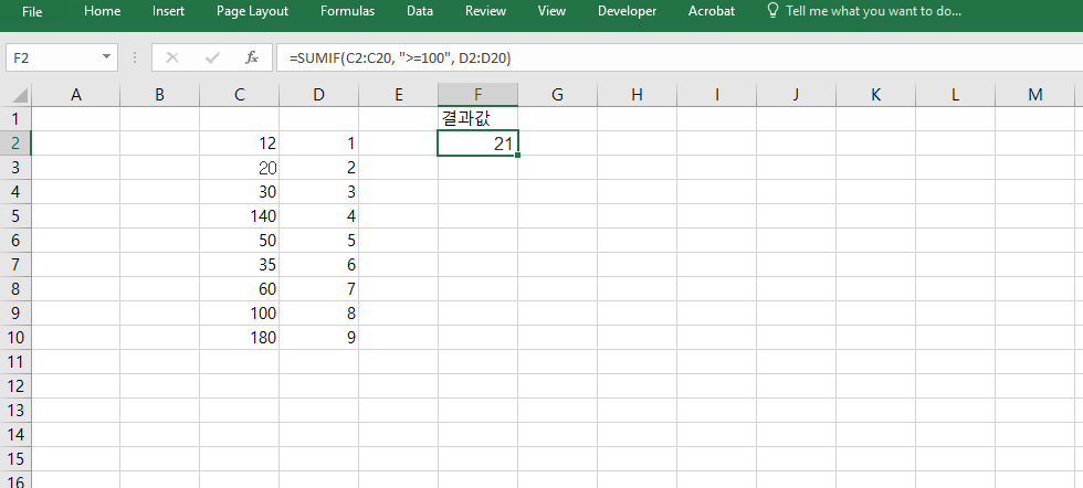 =SUMIF(C2:C20, ">=100", D2:D20)은 C열에서 100 이상인 값을 기준으로 D열의 데이터를 합산합니다. 예산 초과 금액, 일정 기준 이상의 성과금, 특정 실적 이상 금액 합계 등을 자동으로 계산할 수 있어 실적 기반 통계에 적합합니다. 복잡한 필터링 없이 수식만으로 조건 적용이 가능하다는 점이 큰 장점입니다.