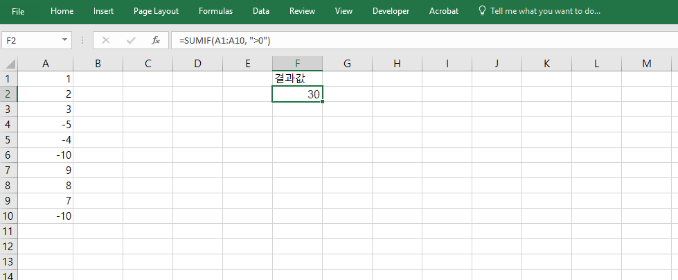 =SUMIF(A1:A10, ">0")처럼 조건 범위와 합계 범위가 같을 수도 있습니다. 이 수식은 A1~A10에서 0보다 큰 수의 합계를 계산합니다. 특정 값을 기준으로 불필요한 값을 제외하고 합산할 수 있기 때문에 오류가 포함된 데이터를 정리하거나, 유효 데이터만을 기준으로 통계를 낼 때 매우 유용합니다.