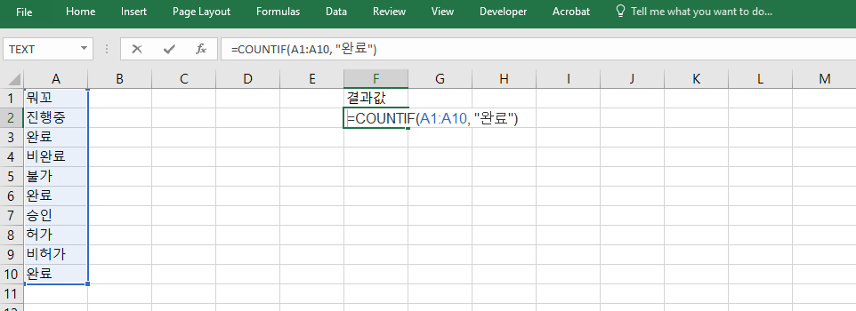 =COUNTIF(A1:A10, "완료") 수식은 A1부터 A10 범위 중 “완료”라는 텍스트가 입력된 셀의 개수를 반환합니다. 업무 진척 상황이나 승인 상태를 카운트할 때 자주 활용되며, 사용자는 조건별 집계를 통해 보고서 작성 시간을 크게 줄일 수 있습니다. 간단한 필터링 역할도 가능하여 자동화된 요약 통계에 활용됩니다.