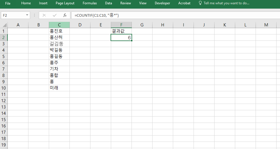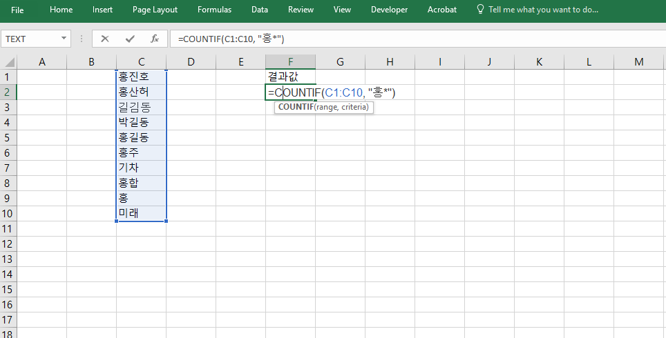 =COUNTIF(C1:C10, "홍*")과 같이 와일드카드(*)를 활용하면 "홍"으로 시작하는 모든 텍스트를 포함하여 계산합니다. 이는 고객 이름, 지역명, 항목명 등 텍스트 기반의 조건 검색에 매우 유용하며, 부분 일치 검색이 필요한 상황에서도 COUNTIF 하나로 대응이 가능합니다. 이름별 통계나 분류 기준 적용에도 활용할 수 있습니다.