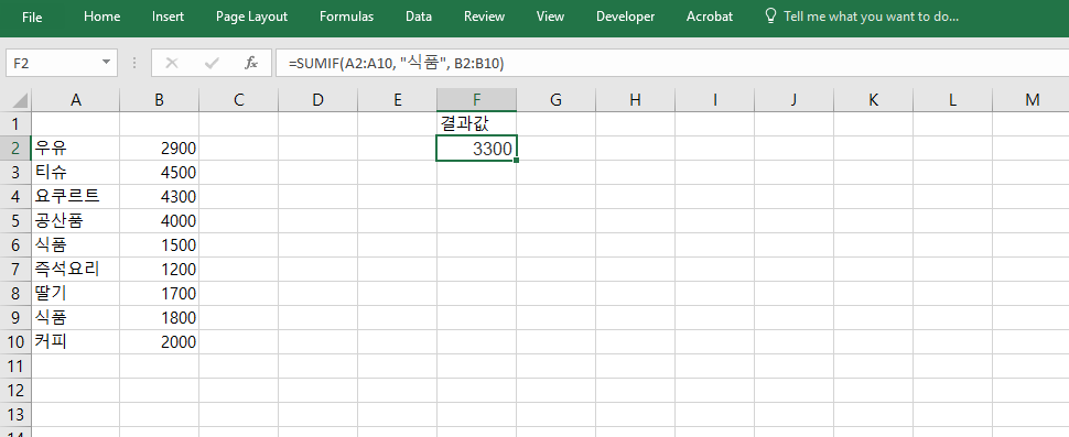 =SUMIF(A2:A10, "식품", B2:B10)은 A열에 “식품”이라는 항목이 있을 때, 그에 대응하는 B열의 값을 합산합니다. 예를 들어 A열이 카테고리, B열이 판매금액이라면 “식품” 카테고리의 매출 합계를 쉽게 구할 수 있습니다. 이 구조는 제품군별 집계, 부서별 예산 계산, 항목별 총계 등에서 매우 강력한 기능을 발휘합니다.