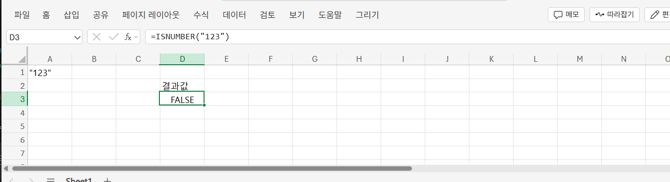 =ISNUMBER("123")는 FALSE를 반환하지만, =ISNUMBER(123)는 TRUE를 반환합니다. 즉, 숫자처럼 보이는 텍스트는 인식되지 않으며, 실제 숫자 형식만 TRUE로 판단됩니다. 데이터 정제 시 형식 확인에 유용합니다.
