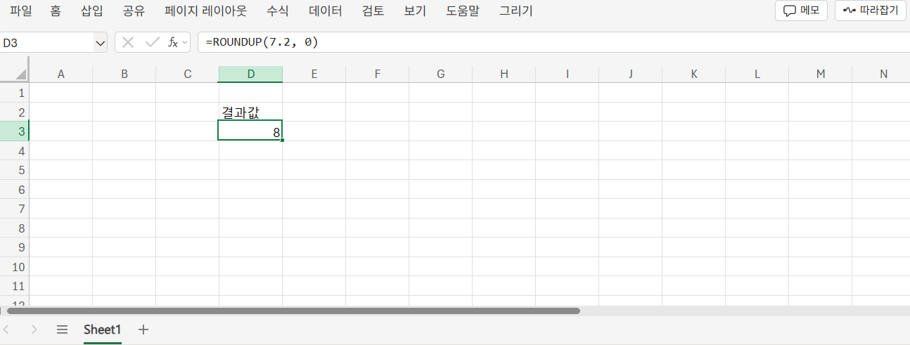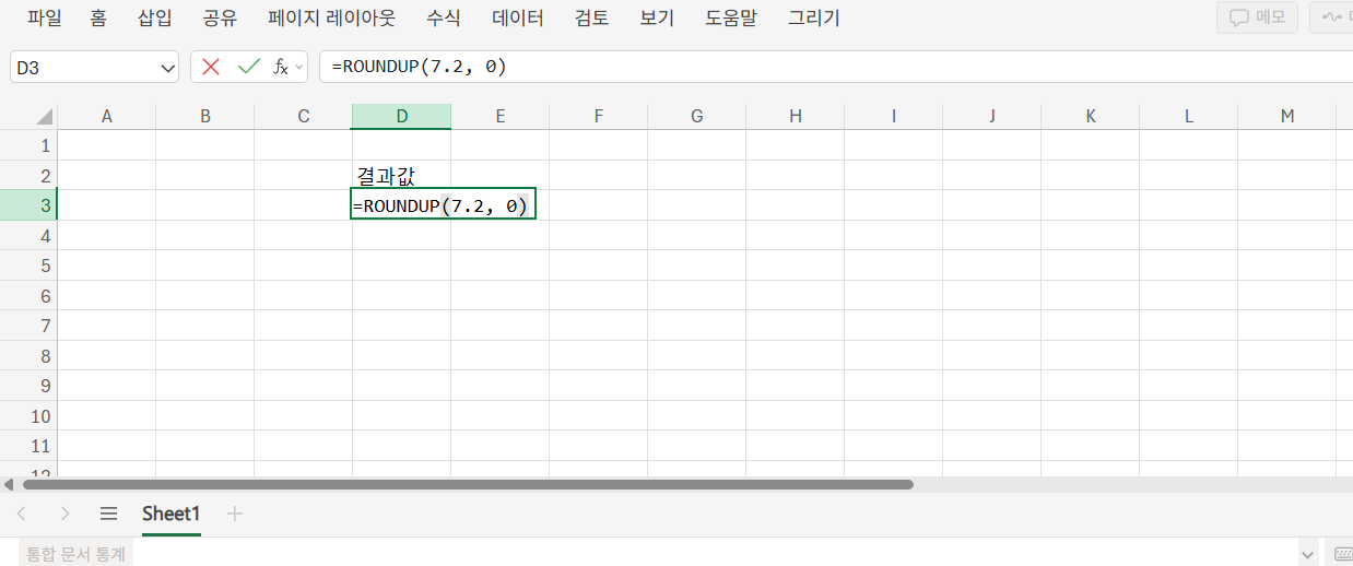 =ROUNDUP(7.2, 0)는 8을 반환합니다. 자릿수를 0으로 하면 소수점을 제거한 정수로 올림 처리되어, 개수 계산, 박스 수량 산정 등에서 유용하게 쓰입니다.