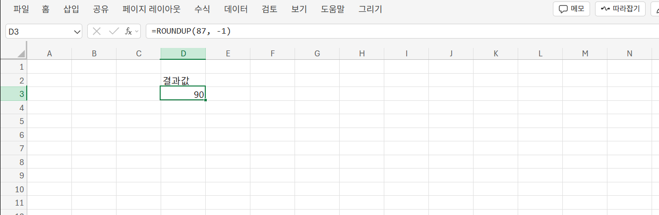 =ROUNDUP(87, -1)는 90을 반환합니다. 자릿수에 -1을 입력하면 10의 자리로 올림, -2면 100단위로 올림됩니다. 이는 예산 근사치 계산, 수량 배치 기준 설정 등에 자주 사용됩니다.