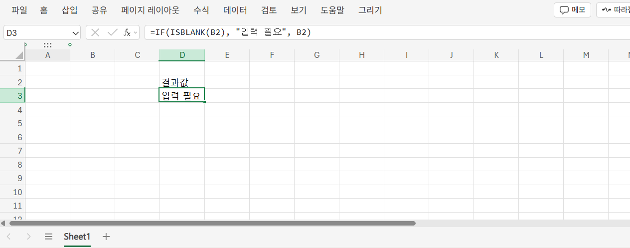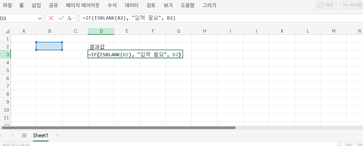 =IF(ISBLANK(B2), "입력 필요", B2)는 B2 셀이 비어 있으면 "입력 필요" 메시지를 출력하고, 값이 있을 경우 해당 값을 그대로 보여줍니다. 입력 폼이나 보고서 작성 시 자동 안내에 적합한 구조입니다.