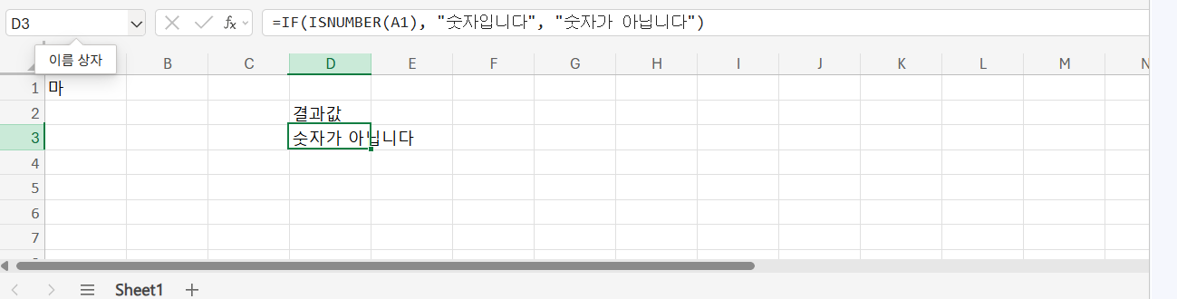 =IF(ISNUMBER(A1), "숫자입니다", "숫자가 아닙니다")는 A1 셀에 숫자가 입력되었는지를 판단하여, 숫자면 "숫자입니다", 아니면 "숫자가 아닙니다"를 출력합니다. 입력값 검증이나 조건 분류에 매우 유용한 방식입니다.