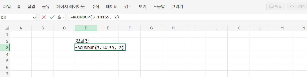 =ROUNDUP(3.14159, 2)는 3.15를 반환합니다. 반올림과 달리 소수점 셋째 자리가 1이라도 무조건 다음 자리로 올림 처리되며, 정확하고 보수적인 계산이 필요할 때 사용됩니다.