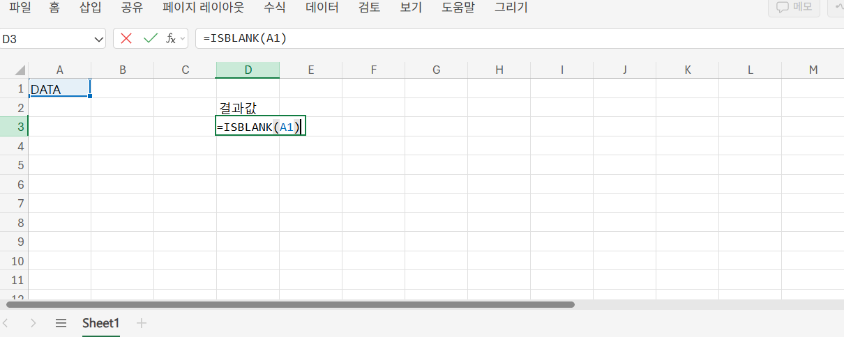 =ISBLANK(A1)은 A1 셀이 완전히 비어 있으면 TRUE를 반환하고, 값이 입력되어 있으면 FALSE를 반환합니다. 설문지 응답 확인, 미입력 항목 점검 등에 유용하게 사용됩니다.