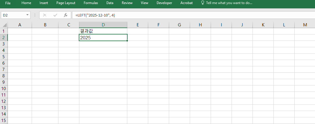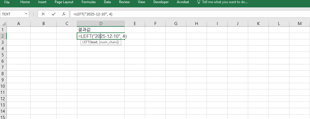 =LEFT("2025-12-10", 4)를 사용하면 결과는 "2025"가 됩니다. 이 수식은 문자열에서 왼쪽에서부터 4개의 문자를 잘라낸 것으로, 날짜 형식의 연도만 추출할 때 사용됩니다. 데이터에서 연도별 분류를 하고자 할 때 빠르게 텍스트에서 숫자 값을 정리할 수 있습니다. 서식이 일정하다면 수백 개의 셀도 동일하게 처리 가능합니다.