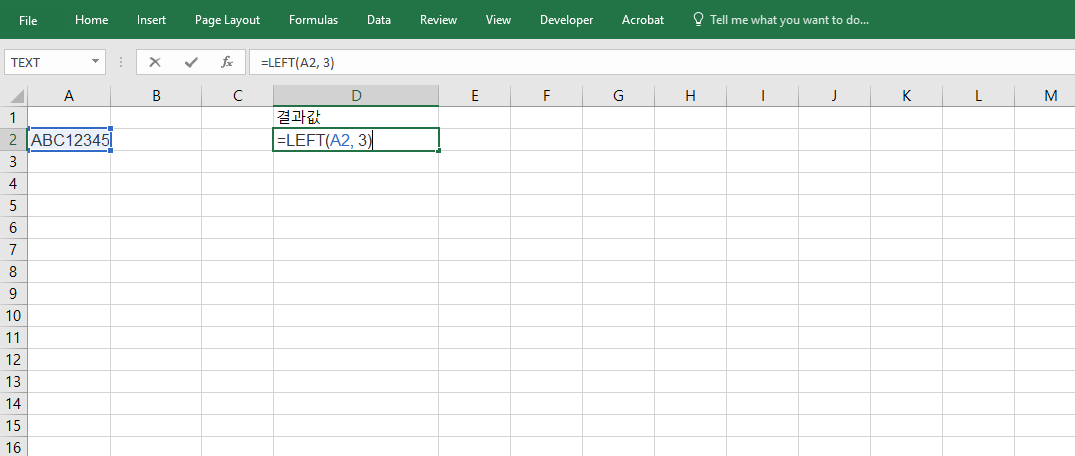 =LEFT(A2, 3)은 A2 셀의 고객번호에서 앞의 3자리만 추출합니다. 예를 들어 "ABC12345"라는 값이 있다면 결과는 "ABC"입니다. 이는 고객 그룹 분류, 지역 코드 구분 등에서 사용할 수 있으며, 고정 길이로 구성된 문자열 데이터를 자동으로 구분할 수 있어 문서 자동화 작업에 매우 적합합니다.