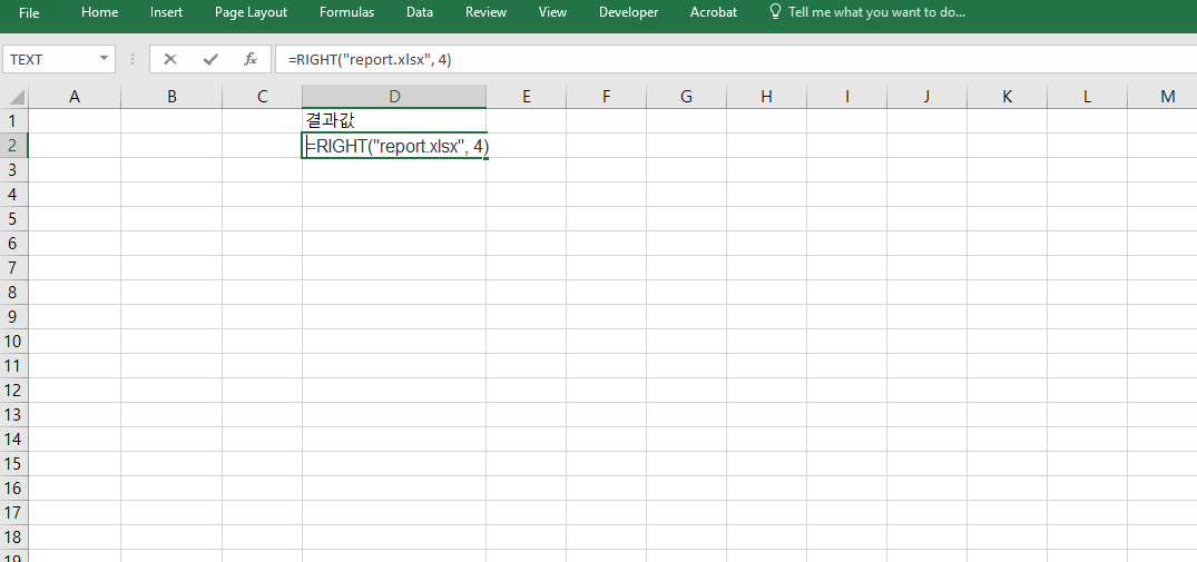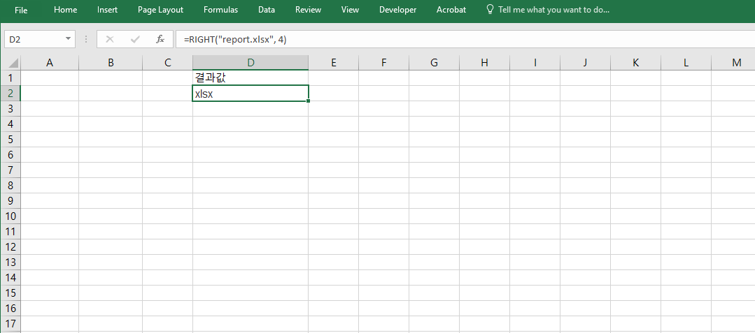 =RIGHT("report.xlsx", 4)를 입력하면 ".xlsx"가 반환됩니다. 이는 파일 이름에서 확장자만 자동으로 분리하여 문서 유형을 구분하거나 필터링할 때 자주 사용됩니다. 특히 대량의 파일 목록을 정리할 때 효율적인 분석이 가능합니다.