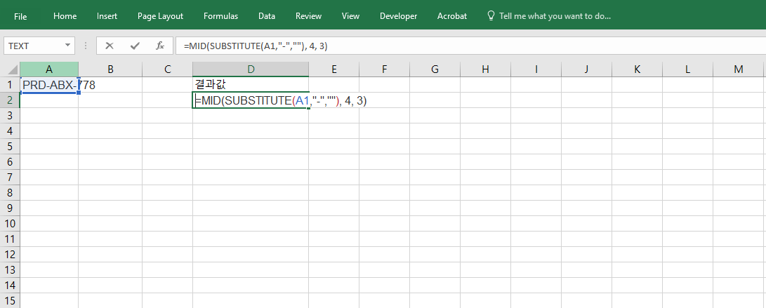 =MID(SUBSTITUTE(A1,"-",""), 4, 3)과 같이 SUBSTITUTE 함수와 결합하면 하이픈(-)을 제거한 후 특정 위치에서 문자를 추출할 수 있습니다. 이는 사용자가 원하는 형태로 데이터를 가공하여 분석할 수 있는 대표적인 예이며, MID 함수는 이렇게 다른 텍스트 함수와 함께 쓸 때 그 활용도가 극대화됩니다.