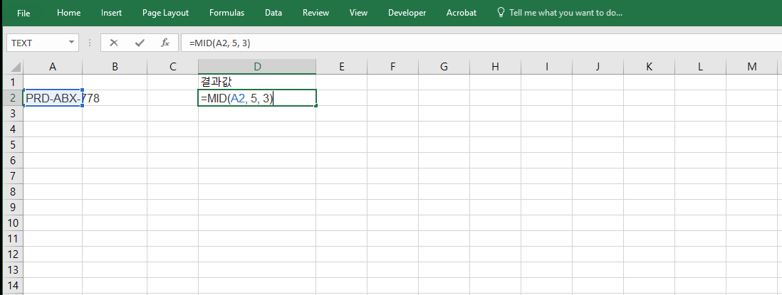 =MID(A2, 5, 3)는 A2 셀의 텍스트에서 5번째 자리부터 3개의 문자를 반환합니다. 예를 들어 "PRD-ABX-778"이라는 값이 있다면 결과는 "ABX"가 됩니다. 제품 카테고리 코드, 중분류 코드 등 다양한 응용이 가능하며, 고정 규칙 기반 코드 정리에 탁월한 기능을 발휘합니다.