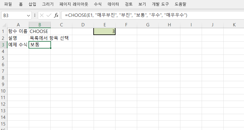 =CHOOSE(B2, "매우부진", "부진", "보통", "우수", "매우우수")
