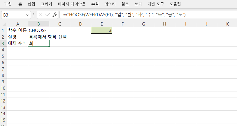 날짜 데이터를 다룰 때 CHOOSE 함수는 진가를 발휘합니다. 예를 들어 WEEKDAY 함수와 결합하여 날짜를 한글 요일로 변환하는 작업이 대표적입니다.
