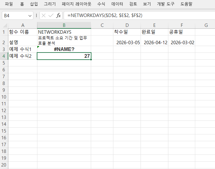 - NETWORKDAYS: 시작일과 '종료일'을 넣으면 그 사이의 **'작업 일수'**가 며칠인지 알려줍니다.