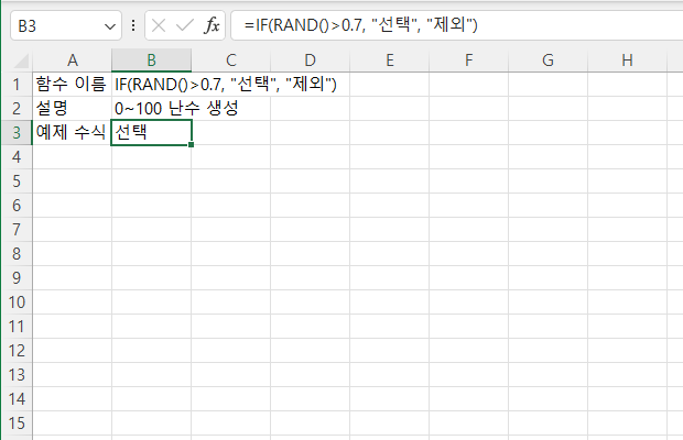 =IF(RAND()>0.7, "선택", "제외")는 약 30% 확률로 "선택"을 반환합니다. 무작위 샘플링, 가중치 필터링, 비율 조건 자동화 등에 유용합니다.
