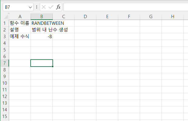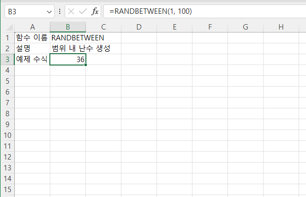 =RANDBETWEEN(1, 100)은 1부터 100 사이의 정수 중 하나를 무작위로 반환합니다. 데이터 샘플 생성, 랜덤 퀴즈 번호, 상품 추첨 번호 등에 적합합니다.