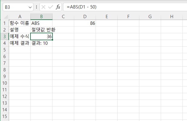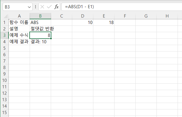 =ABS(D1 - E1)는 두 값의 차이를 양수로 반환합니다. 수치 간의 오차 또는 차이 분석을 할 때 부호와 관계없이 거리 개념으로 계산할 수 있어 실무에서 많이 활용됩니다.