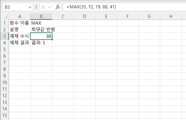 =MAX(35, 72, 19, 88, 41)는 88을 반환합니다. 범위가 아닌 개별 숫자를 직접 비교하고자 할 때 빠르게 최대값을 구할 수 있어 계산 편의성이 높습니다.