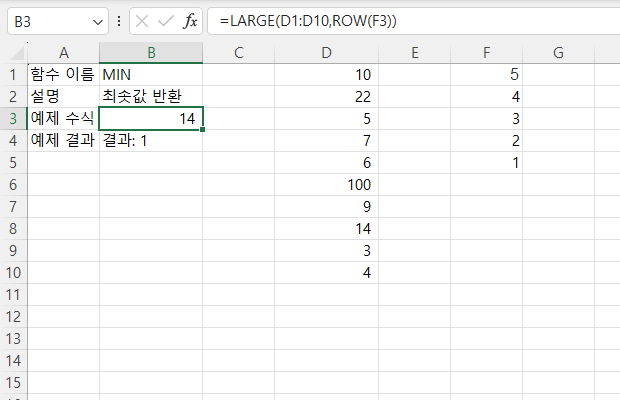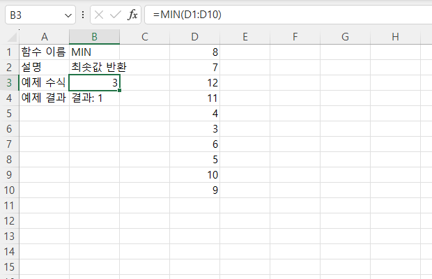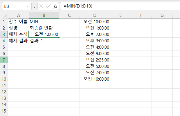 =MIN(D1:D10)가 시간 형식으로 되어 있다면 하루 중 **가장 이른 시간**을 찾을 수 있습니다. 출근 시간, 호출 시간, 예약 시간 분석 등에 사용됩니다.