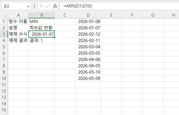 =MIN(D1:D10)은 날짜 중 가장 빠른 날짜, 즉 **가장 오래된 데이터**를 반환합니다. 계약 시작일, 첫 등록일, 최초 구매일 등을 분석할 때 사용됩니다.