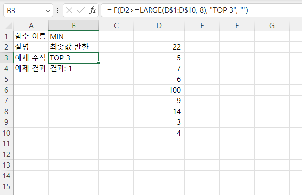 =IF(D2>=LARGE(D$1:D$10, 3), "TOP 3", "") 수식을 사용하면 D2가 상위 3위 이내인 경우 "TOP 3" 라고 표시됩니다. 상위 그룹 자동 태깅, 조건부 서식 설정 등에도 자주 활용됩니다.