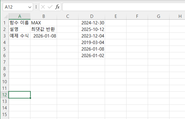 =MAX(D1:D6)에서 D열이 날짜 형식일 경우, 가장 **최근 날짜**를 반환합니다. 최신 등록일, 최근 주문일, 마지막 점검일 등 시간 관련 데이터를 분석할 때도 활용됩니다.