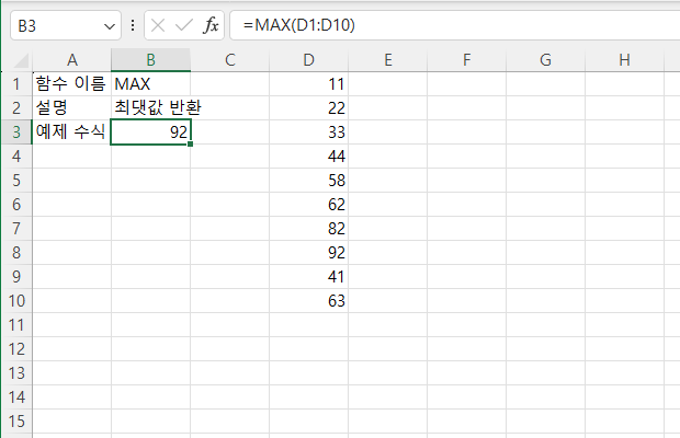 =MAX(D1:D10)은 B2부터 B10까지 학생들의 시험 점수 중 가장 높은 점수를 반환합니다. 성적 분석이나 시상자 선정 등에서 필수적으로 사용됩니다.