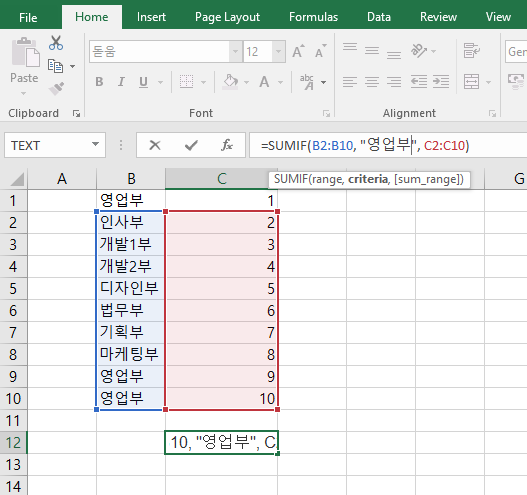 파란색(B) 영역에서 영업부의 빨간색의 값(C)을 찾아 합계를 구하면 19가 계산됩니다.