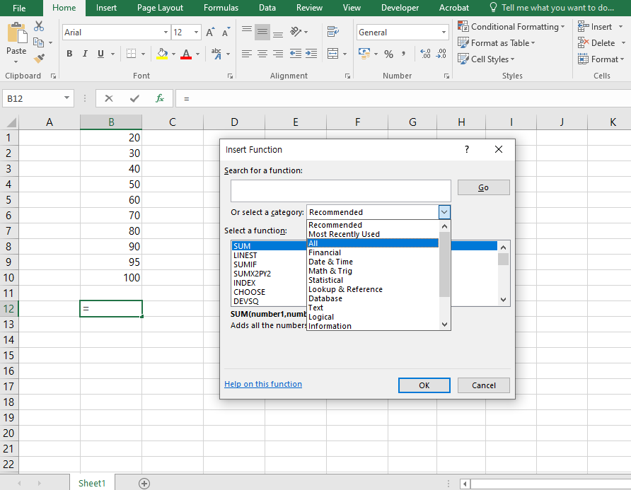 카테고리를 선택한 후 함수를 선택하고 'OK' 버튼을 클릭합니다.