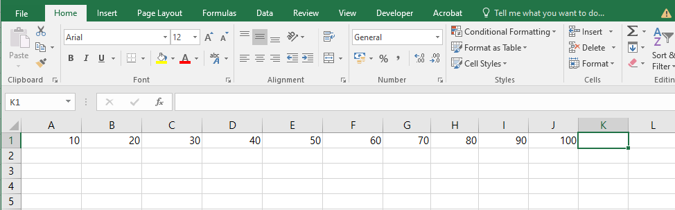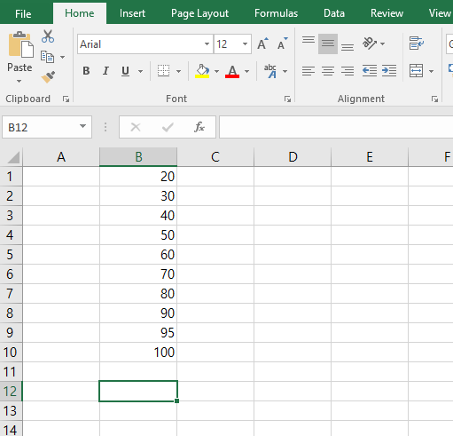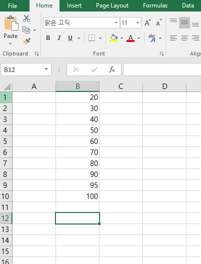 B열에 10행까지 데이터를 넣어보겠습니다. 일단 여기서는 데이터를 숫자로 하겠습니다.