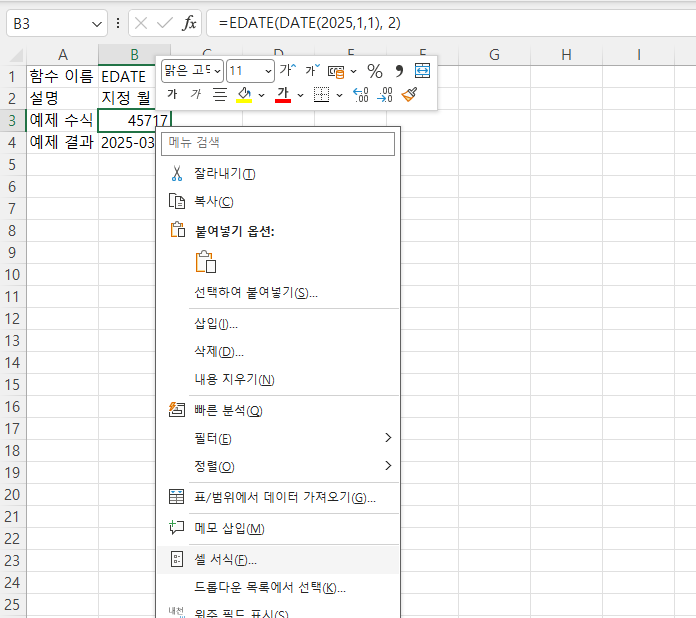 EDATE 함수를 썼는데 날짜가 아닌 이상한 숫자가 나온다면, 이는 셀의 표시 형식이 '일반'으로 되어 있기 때문입니다. 엑셀은 내부적으로 날짜를 숫자로 저장하므로, [셀 서식(Ctrl+1)]에서 표시 형식을 **'날짜'**로 변경해주면 즉시 해결됩니다.