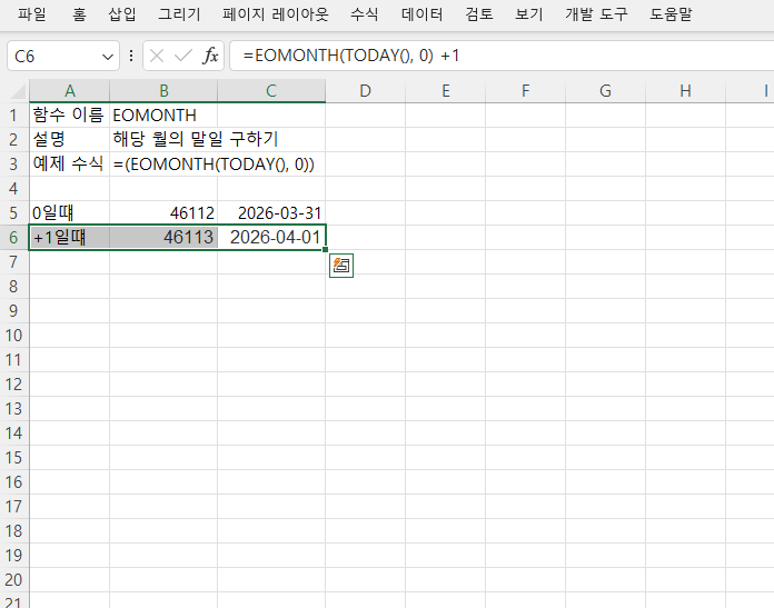 - 양수(예: 1)를 입력하면 **미래의 특정 월 말일**을 구합니다.