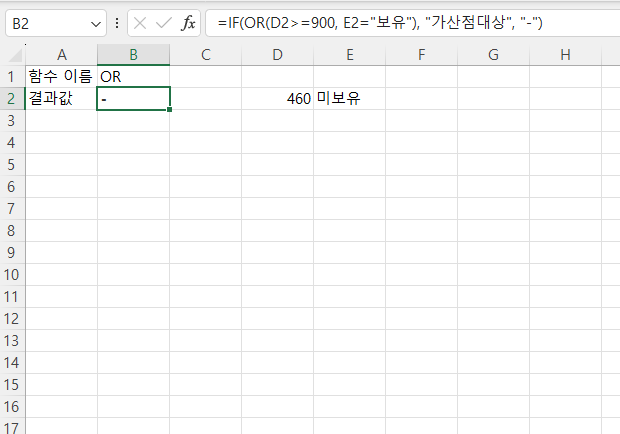 =IF(OR(D2>=900, E2="보유"), "가산점대상", "-")
